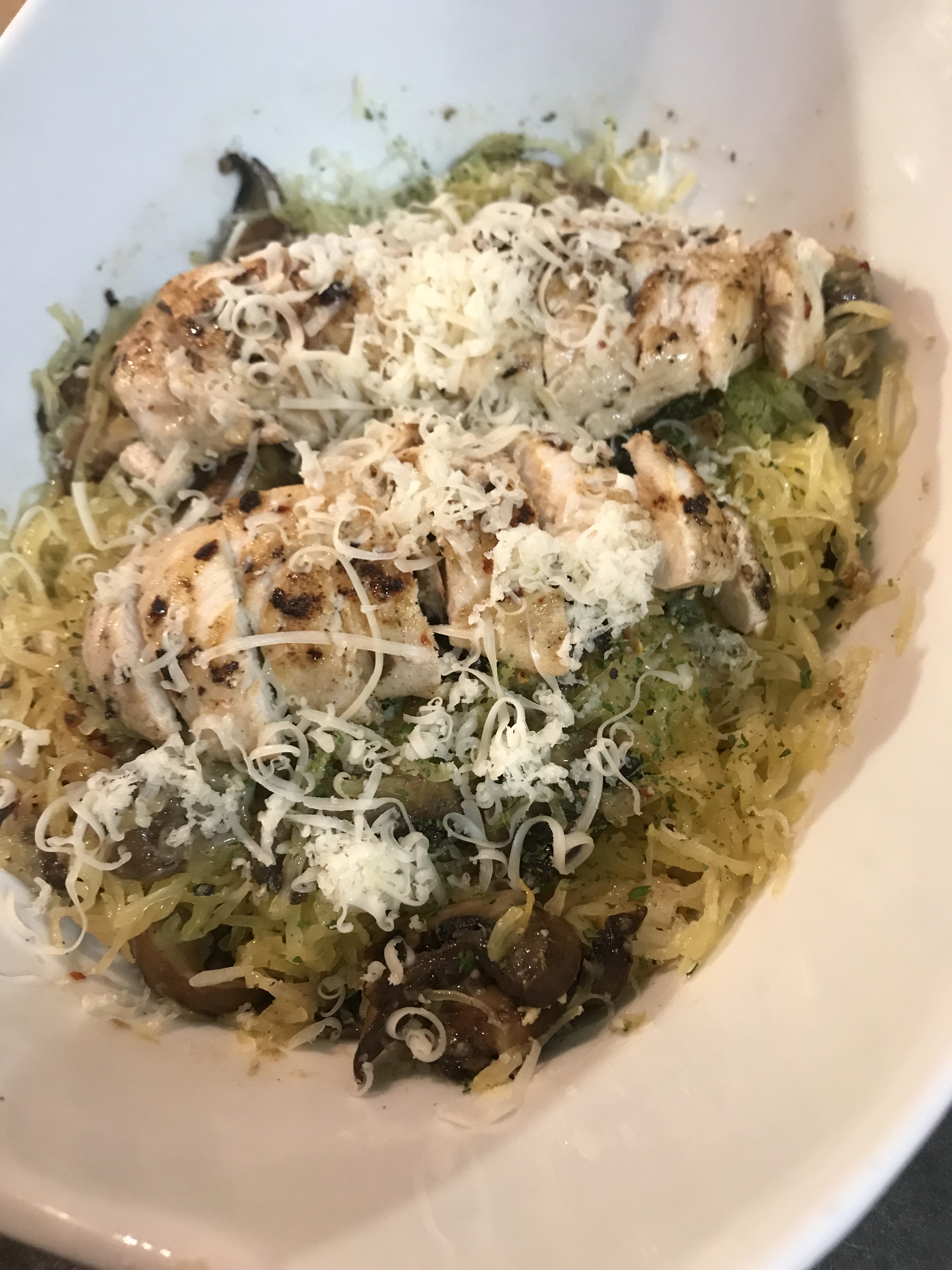 spaghetti(zucca) di pollo e funghi con aglio e olio