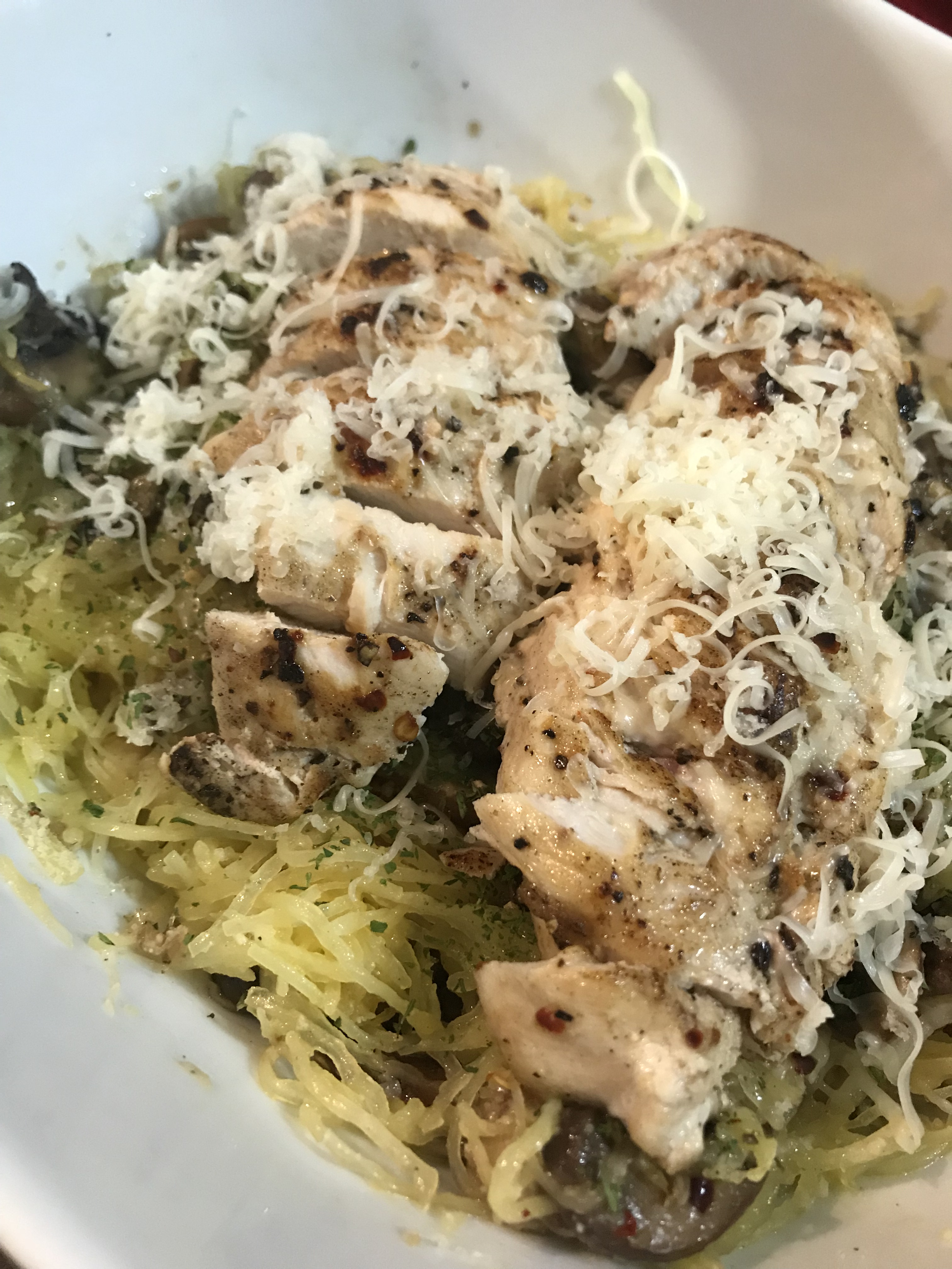 spaghetti(zucca) di pollo e funghi con aglio e olio