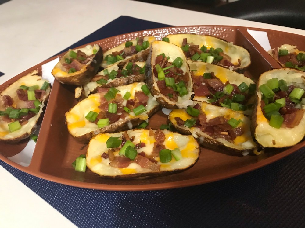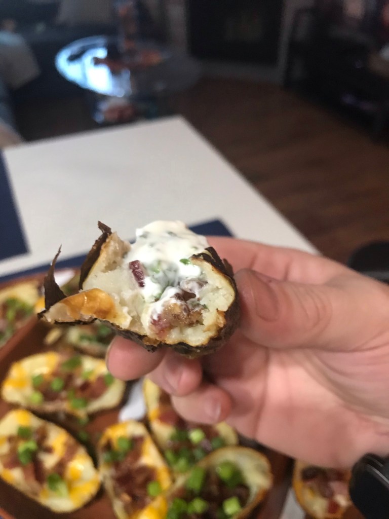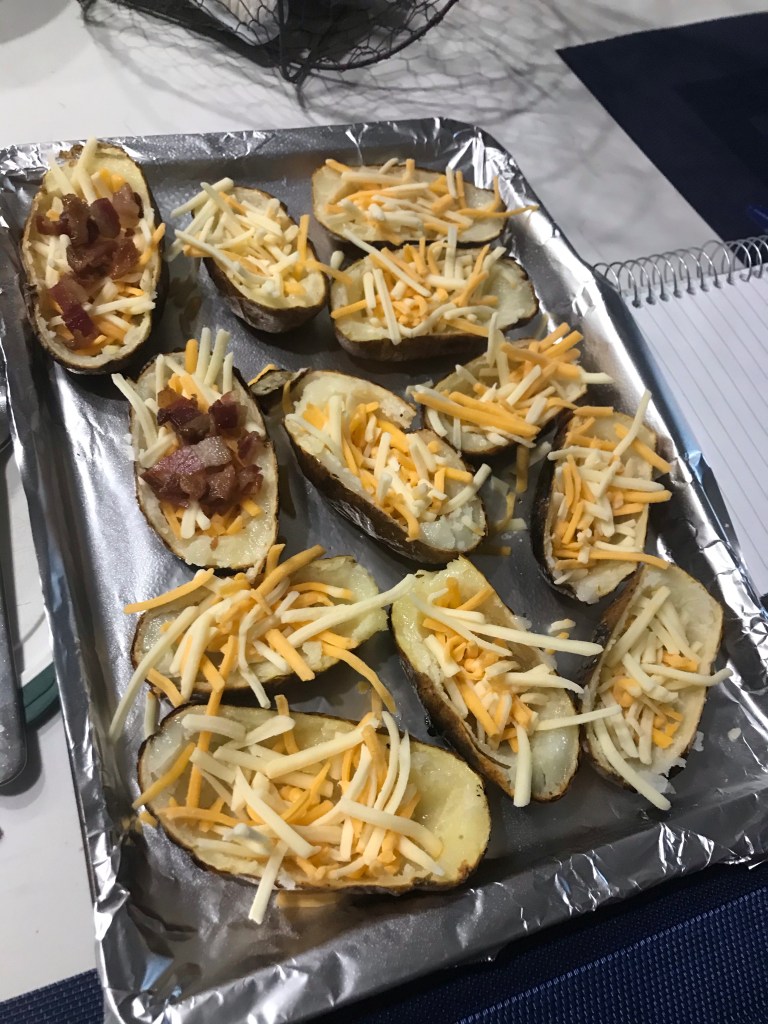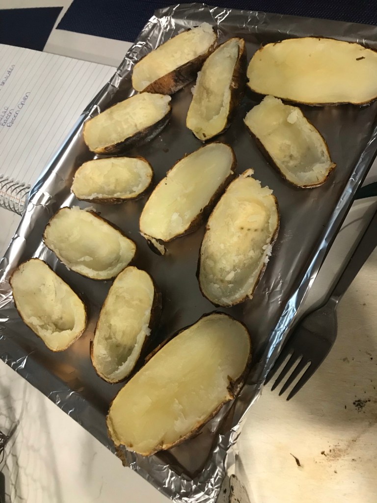 - Scoop out the center of the potatoes so you have a nice boat looking potato