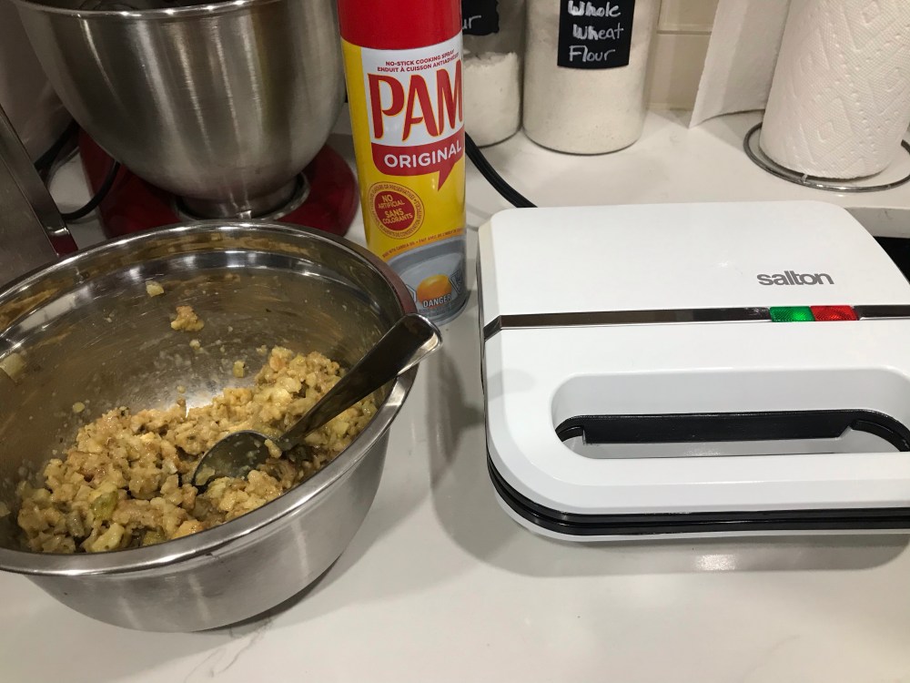- PAM the waffle maker and then place 2 heaping scoops in your waffle maker and press down