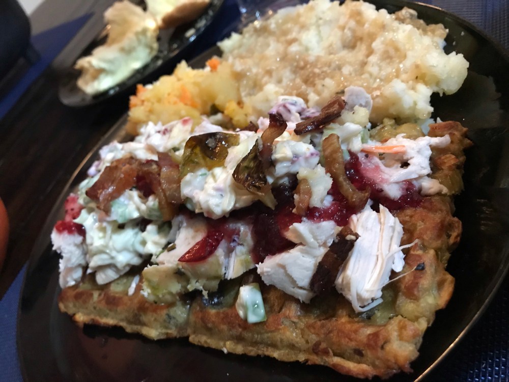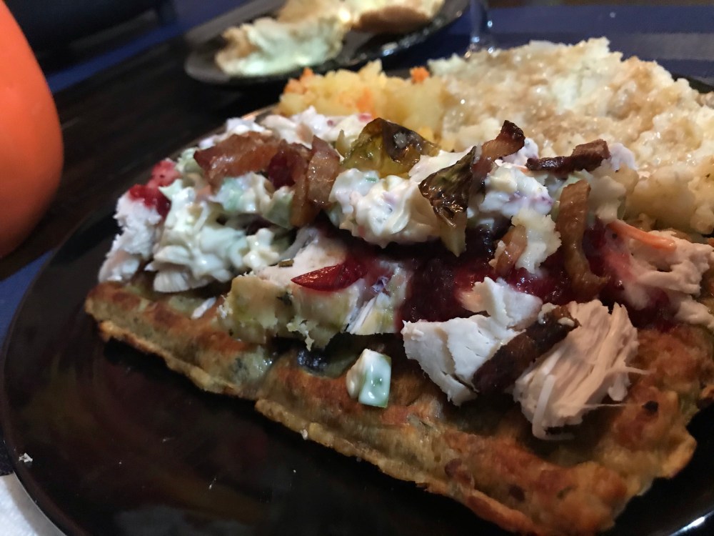 - Once waffles are out of the oven, top with desired toppings like Turkey, cranberries, gravy, mashed potatoes, coleslaw – WHATEVER you desire