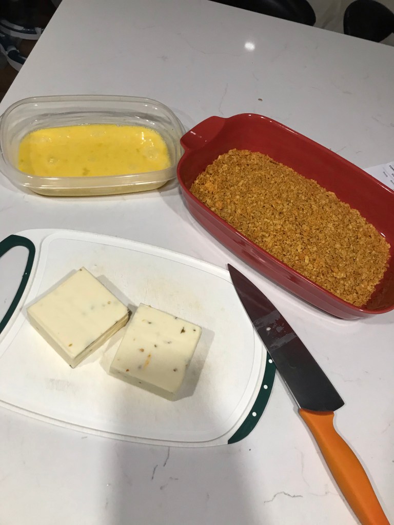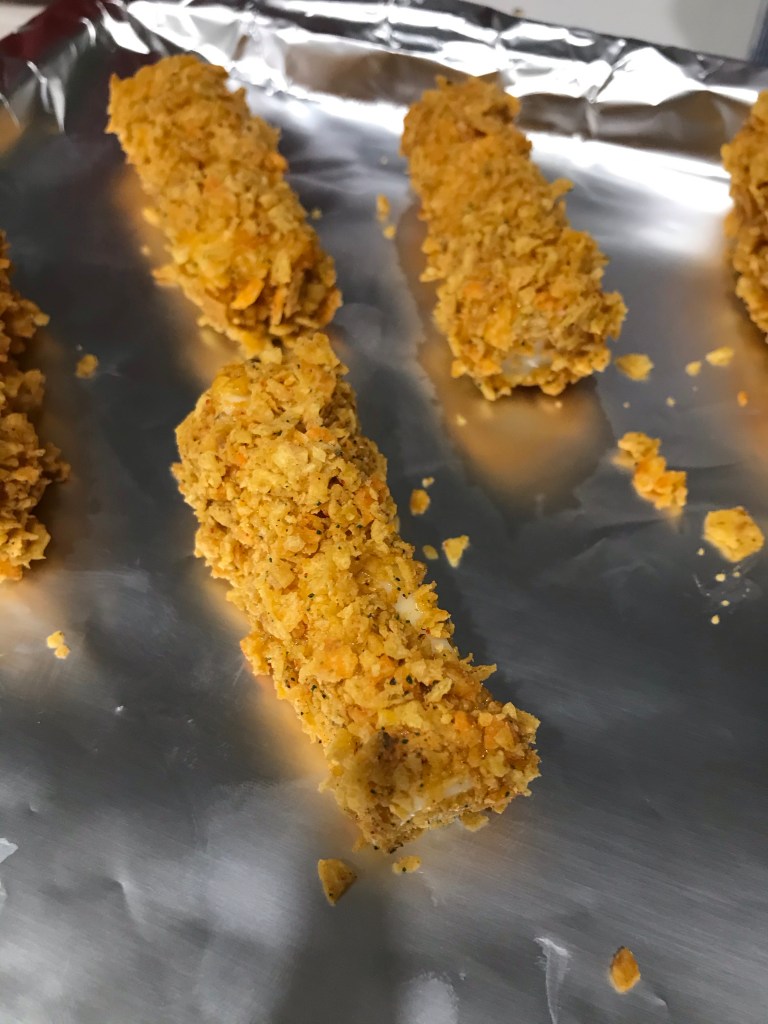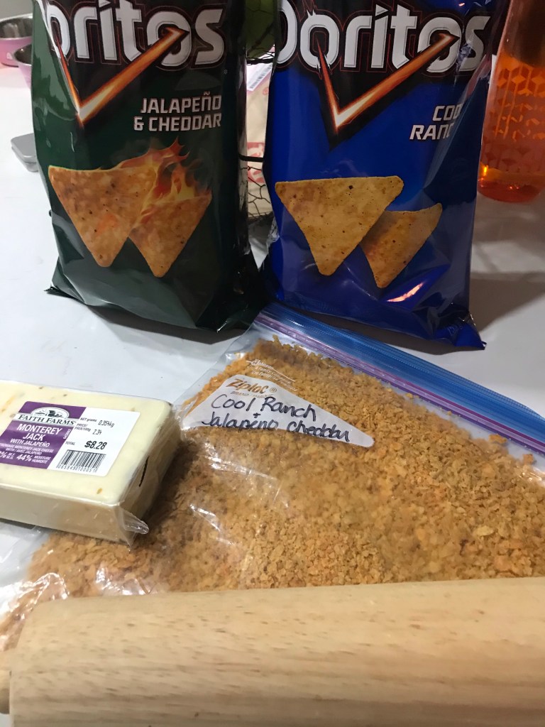 - Set up your station cheese sticks, egg mixture, Doritos crumbs