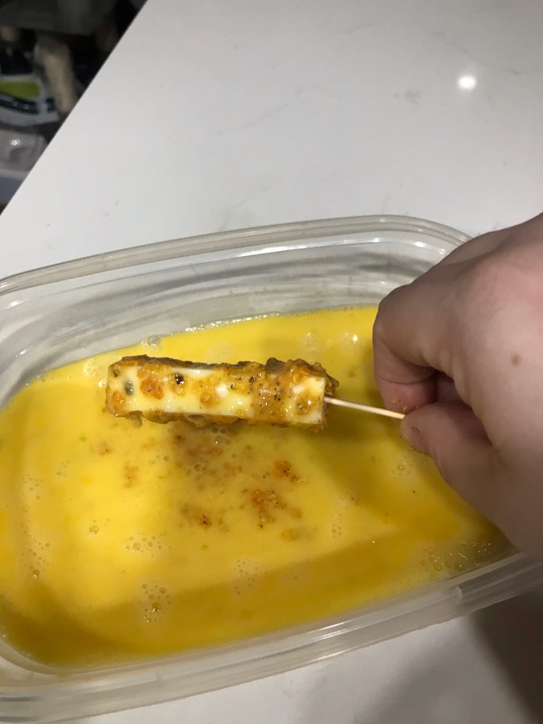 - Take your cut cheese sticks and put one at time into the egg mixture